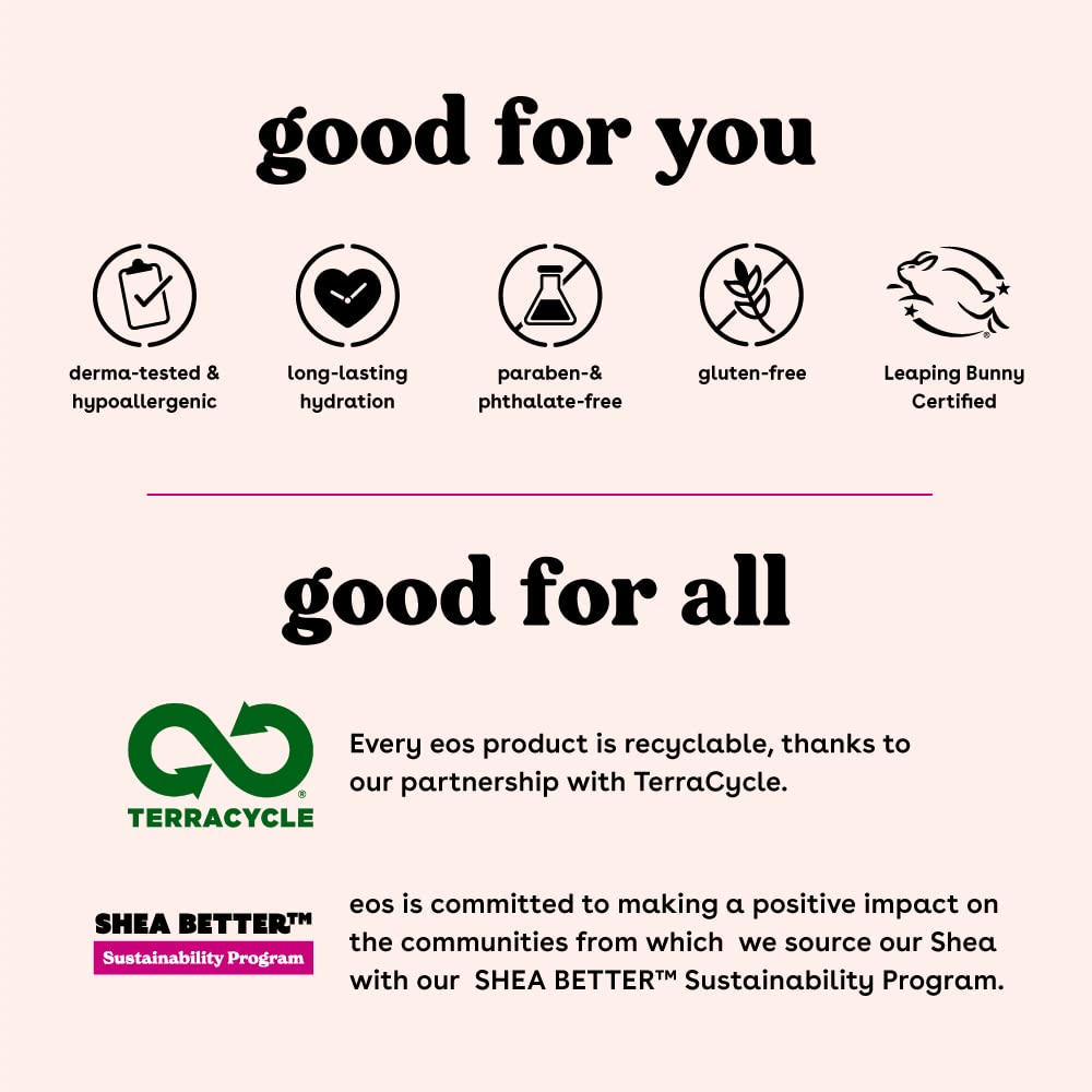 - ALL-NATURAL SHEA BUTTER: eos products have wild grown, sustainably-sourced 100% natural shea butter to make skin feel moisturized, protected and soft. We are paraben, phthalate and gluten free. Dermatologist tested. Vegan. Hypoallergenic. Cruelty-Free. No products tested on animals.