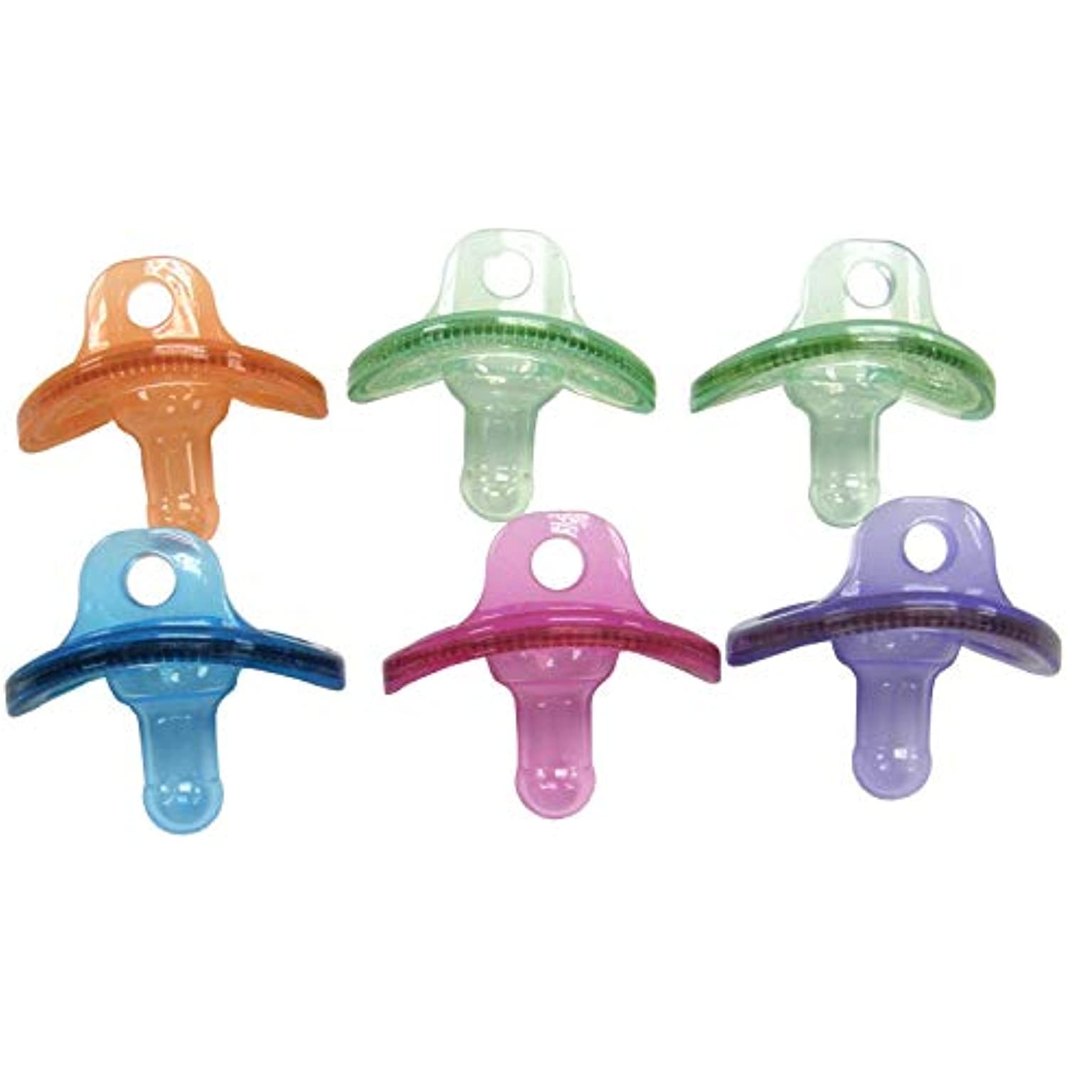 Silicone pacifier. Unique design is shaped to fit comfortably against baby’s face, while keeping their nose from being covered. Latex free silicone. Easily works with most pacifier attachments. Age range is 0-3 months. 2 count. Made in China.