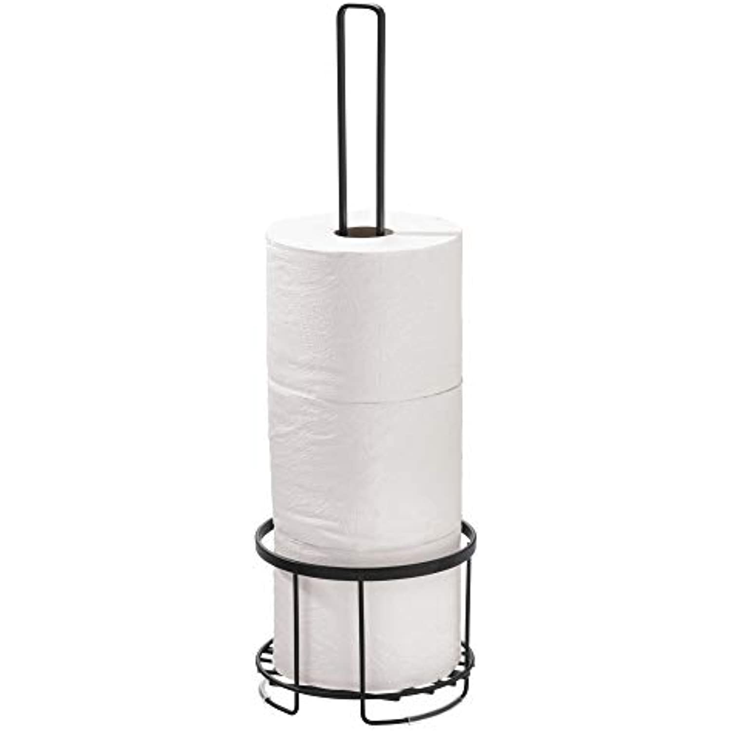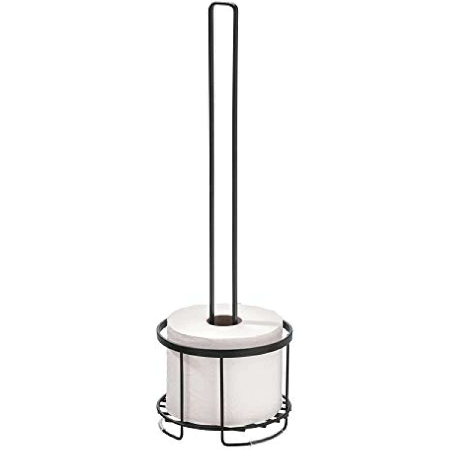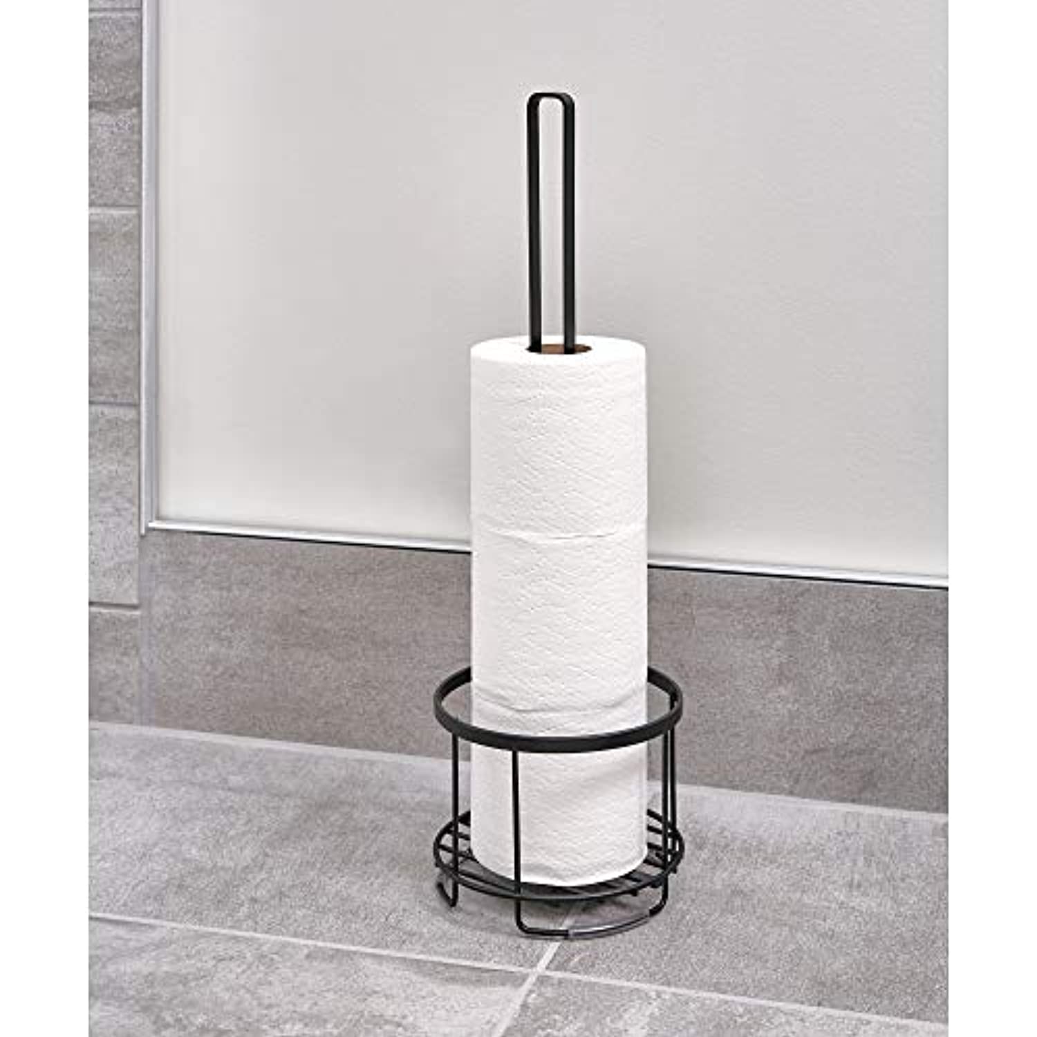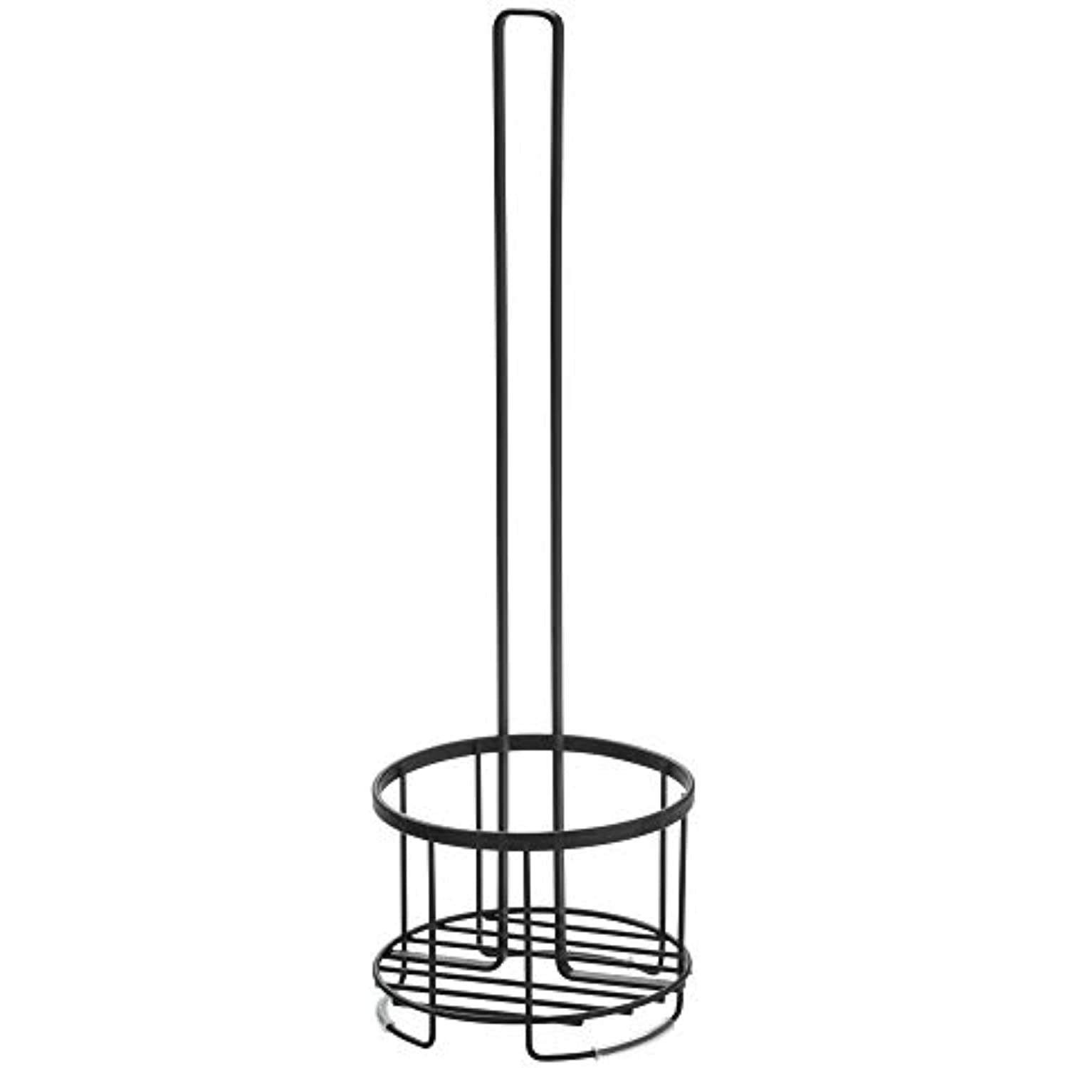 Add a functional and decorative touch to your bathroom storage with the iDesign Everett Free Standing Bathroom Toilet Paper Holder. This tall, free standing toilet paper holder stand provides storage for up to four extra rolls of toilet paper, including standard, mega, and jumbo sized rolls, and the raised base keeps toilet paper clean, dry, and off the ground. The lightweight design allows you to take toilet paper anywhere you need it – from the master bathroom to guest or hall bathroom. Simply place spare rolls onto the center holding stand for easy refills and access. Featuring a modern design and matte black finish, this toilet paper storage organizer complements a variety of home and bathroom decor styles. Designed for long-lasting durability, the powder-coated, rust-resistant steel construction stands up to every day use. Measuring 6. 14″ x 6. 14″ x 19. 36″, this toilet paper roll holder is perfect for adding extra storage in compact spaces in the bathroom. With iDesign by InterDesign, you can #LiveSimply every day.